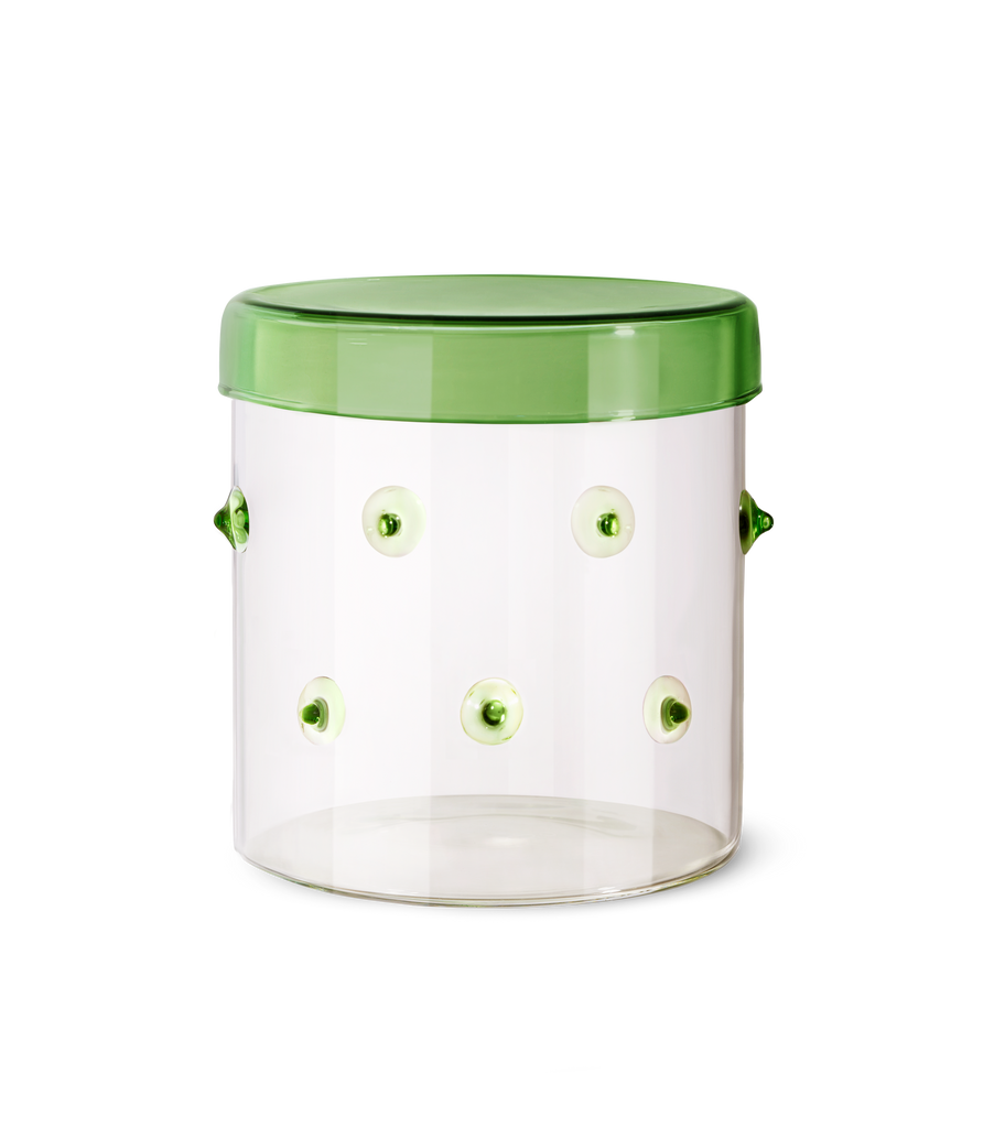 Crafted from clear borosilicate glass, the cylindrical containers merger seamlessly contemporary design with traditional glass-making techniques. The result is a playful version of an everyday object.