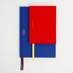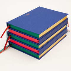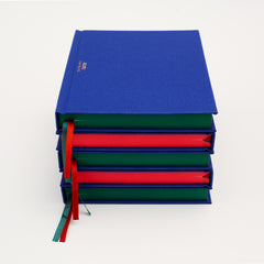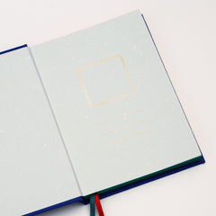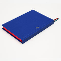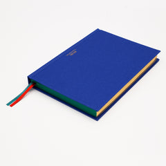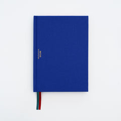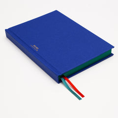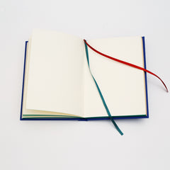 The hardcover notebook is bound in a blue fabric using hollow back binding which allow the pages to lay flat when open.
